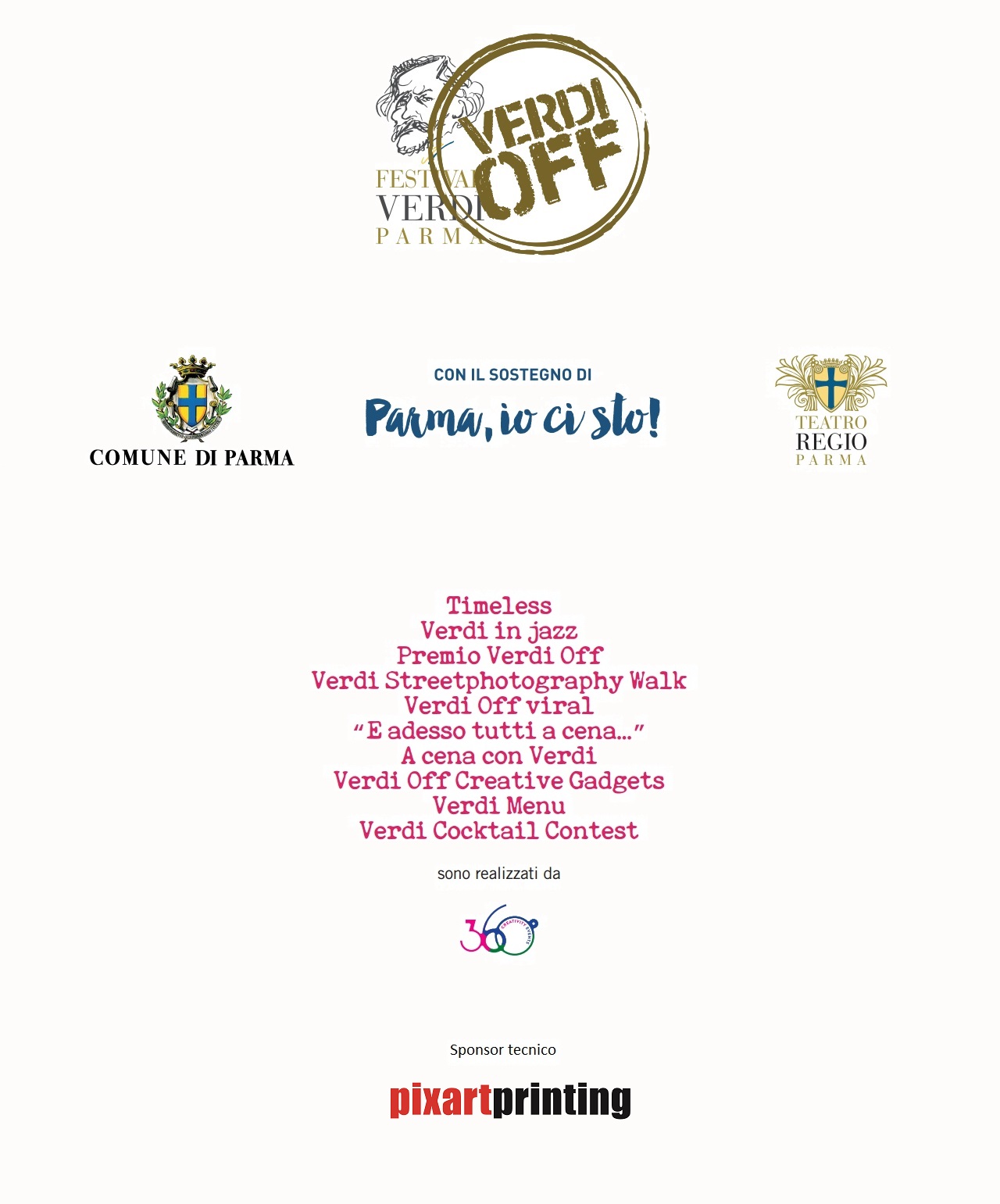 Sono tante le iniziative che compongono Verdi Off. Il programma completo sarà presentato il prossimo 9 settembre. Concerti nelle case, film, passeggiate in carrozza alla scoperta della città, mostre fotografiche, tramonti, notti e albe verdiane, incursioni spettacolari nei parchi cittadini, art contest. Questo e altro ancora per stimolare la voglia di fare Festival in città nel nome di Verdi, coinvolgendo persone e luoghi che sono solo apparentemente lontani dall’opera e dalla musica. Ringraziamo l’Associazione “Parma, io ci sto!” che ha scelto di dedicare il suo primo progetto culturale al Festival Verdi. Parma e Busseto rappresentano il cuore pulsante della musica verdiana e ci auguriamo che le iniziative di Verdi Off che coinvolgono la Città possano già a partire dalle prossime edizioni allargarsi alle terre del Maestro.