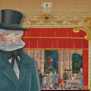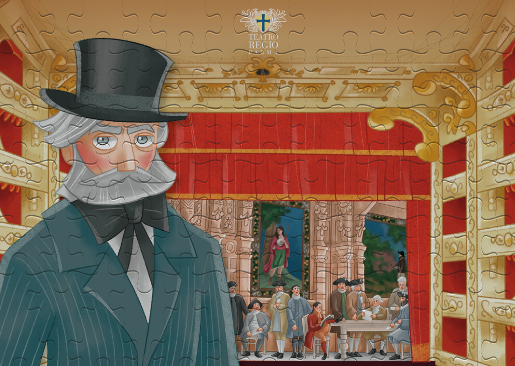 Per i più piccoli, un baby puzzle da 96 pezzi con un simpatico ma severo Giuseppe Verdi al Teatro Regio di Parma tratto dal libro “Giuseppe Verdi, il cigno di Busseto” di Cristina Bersanelli con le illustrazioni di Patrizia Barbieri.