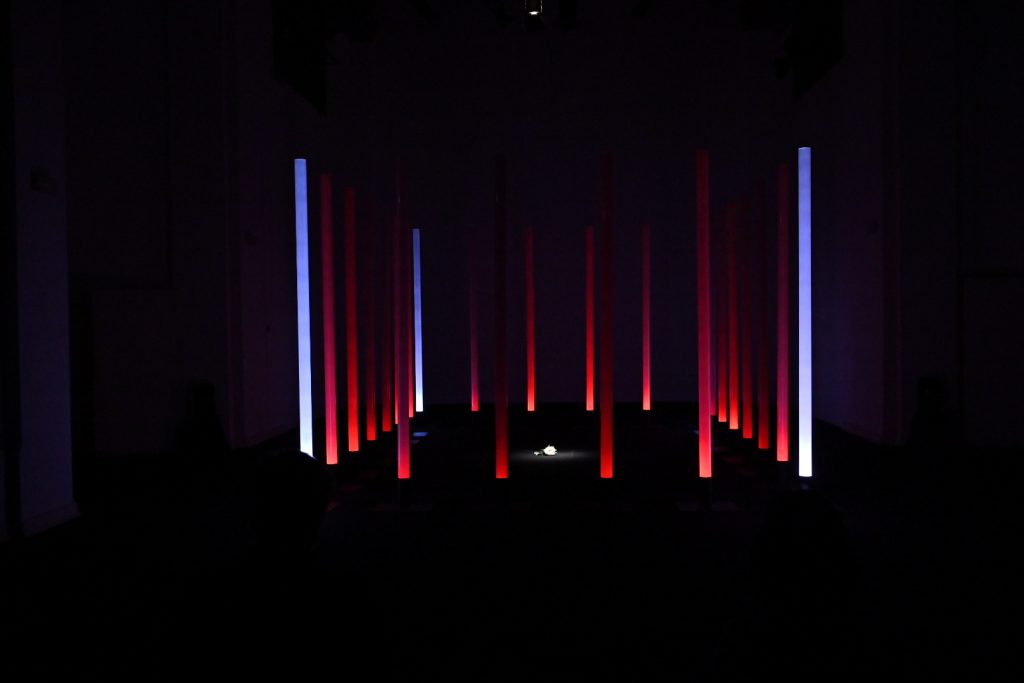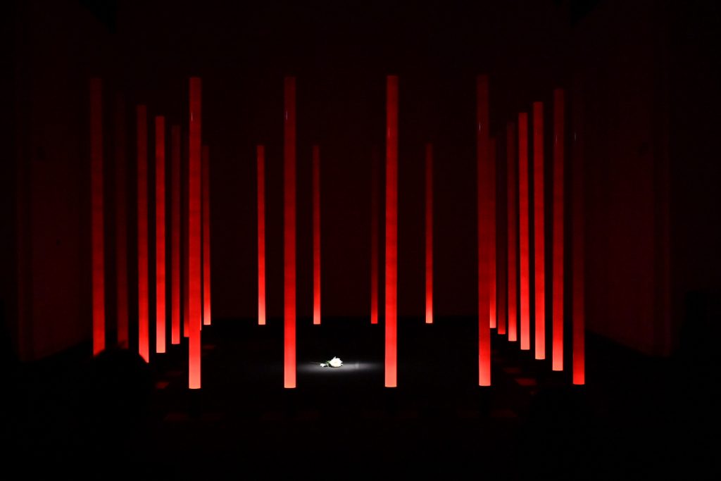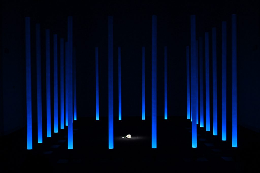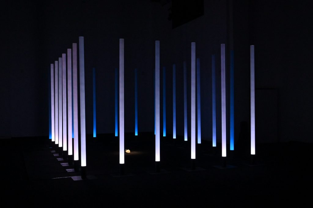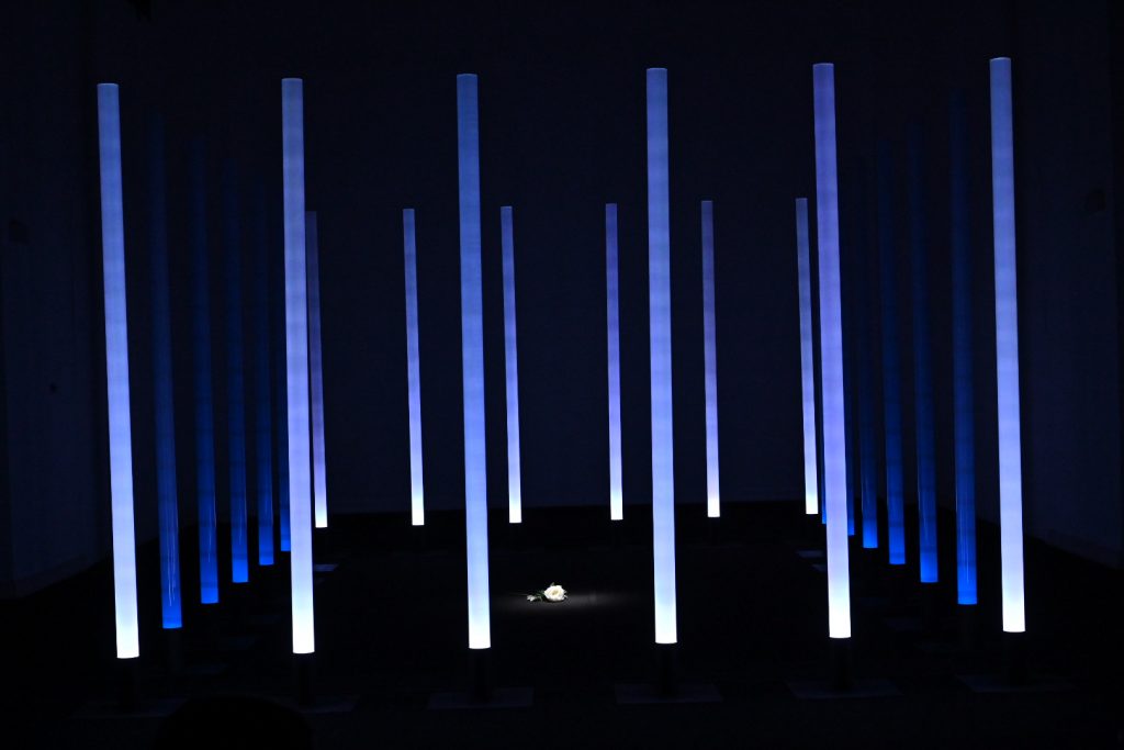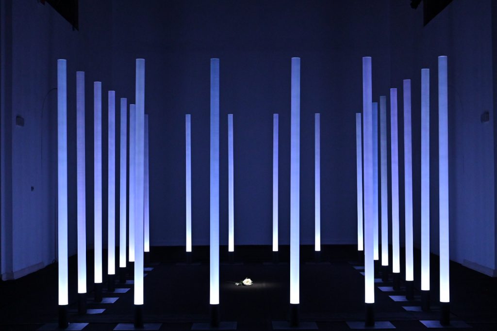 “Ho scelto di lavorare su La traviata e sul personaggio di Violetta perché la ritengo l’opera più attuale di Verdi. Soprattutto il personaggio di Violetta, una donna “libera” ma ingabbiata fino ad ucciderla, da una società maschilista e patriarcale. Cosa che purtroppo succede ancora oggi ogni giorno a moltissime donne (e ritengo la nostra società ancora molto maschilista e patriarcale). L’installazione vuole raccontare questo, sempre con la lievità e la poesia che il coro di luce consente. In concreto ho disposto le colonne a fare un rettangolo di circa 5m x 7m. All’interno del rettangolo, sul pavimento nero della sala, riempirò di petali di camelia bianchi. L’idea è quella di un coro di uomini che fa da gabbia e all’interno il mondo di Violetta, o meglio, ciò che ne rimane. L’audio coerentemente è un montaggio di frammenti diviso in due sezioni. La base è un leggero suono elettronico mescolato alle prime note delicatissime del preludio (è l’anima di Violetta). Su questa irrompono voci e cori maschili a sovrastarla. Ho volutamente escluso le parti cantate di Violetta e ogni altra voce femminile, anche dal brindisi, e tenuto solo gli uomini (Alfredo e il padre soprattutto)”. Stefano Mazzanti