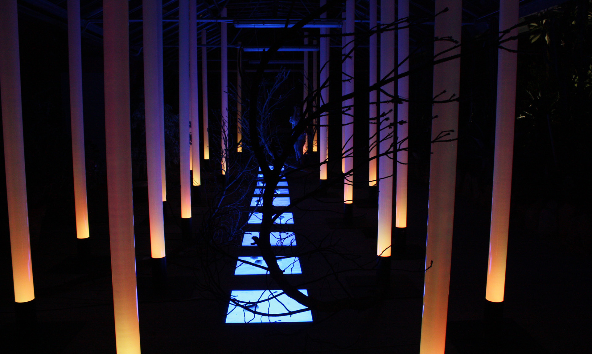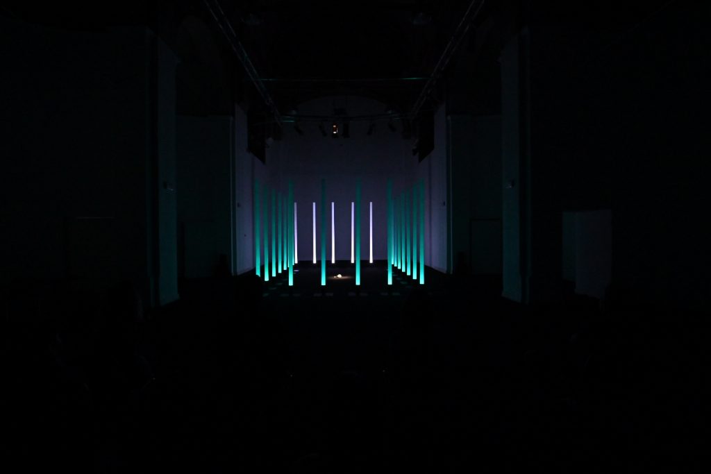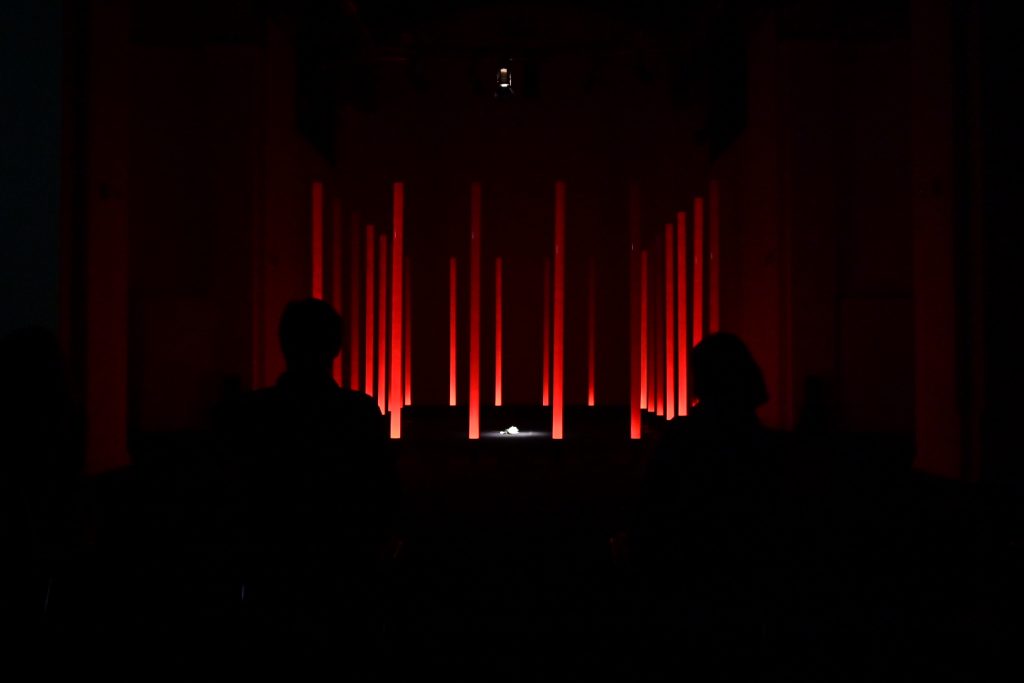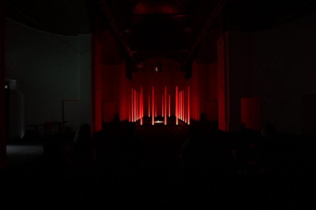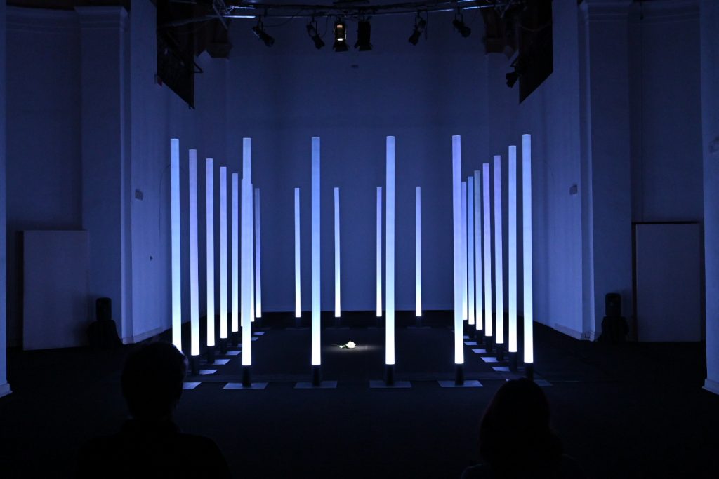 “Ho scelto di lavorare su La traviata e sul personaggio di Violetta perché la ritengo l’opera più attuale di Verdi. Soprattutto il personaggio di Violetta, una donna “libera” ma ingabbiata fino ad ucciderla, da una società maschilista e patriarcale. Cosa che purtroppo succede ancora oggi ogni giorno a moltissime donne (e ritengo la nostra società ancora molto maschilista e patriarcale). L’installazione vuole raccontare questo, sempre con la lievità e la poesia che il coro di luce consente. In concreto ho disposto le colonne a fare un rettangolo di circa 5m x 7m. All’interno del rettangolo, sul pavimento nero della sala, riempirò di petali di camelia bianchi. L’idea è quella di un coro di uomini che fa da gabbia e all’interno il mondo di Violetta, o meglio, ciò che ne rimane. L’audio coerentemente è un montaggio di frammenti diviso in due sezioni. La base è un leggero suono elettronico mescolato alle prime note delicatissime del preludio (è l’anima di Violetta). Su questa irrompono voci e cori maschili a sovrastarla. Ho volutamente escluso le parti cantate di Violetta e ogni altra voce femminile, anche dal brindisi, e tenuto solo gli uomini (Alfredo e il padre soprattutto)”. Stefano Mazzanti
