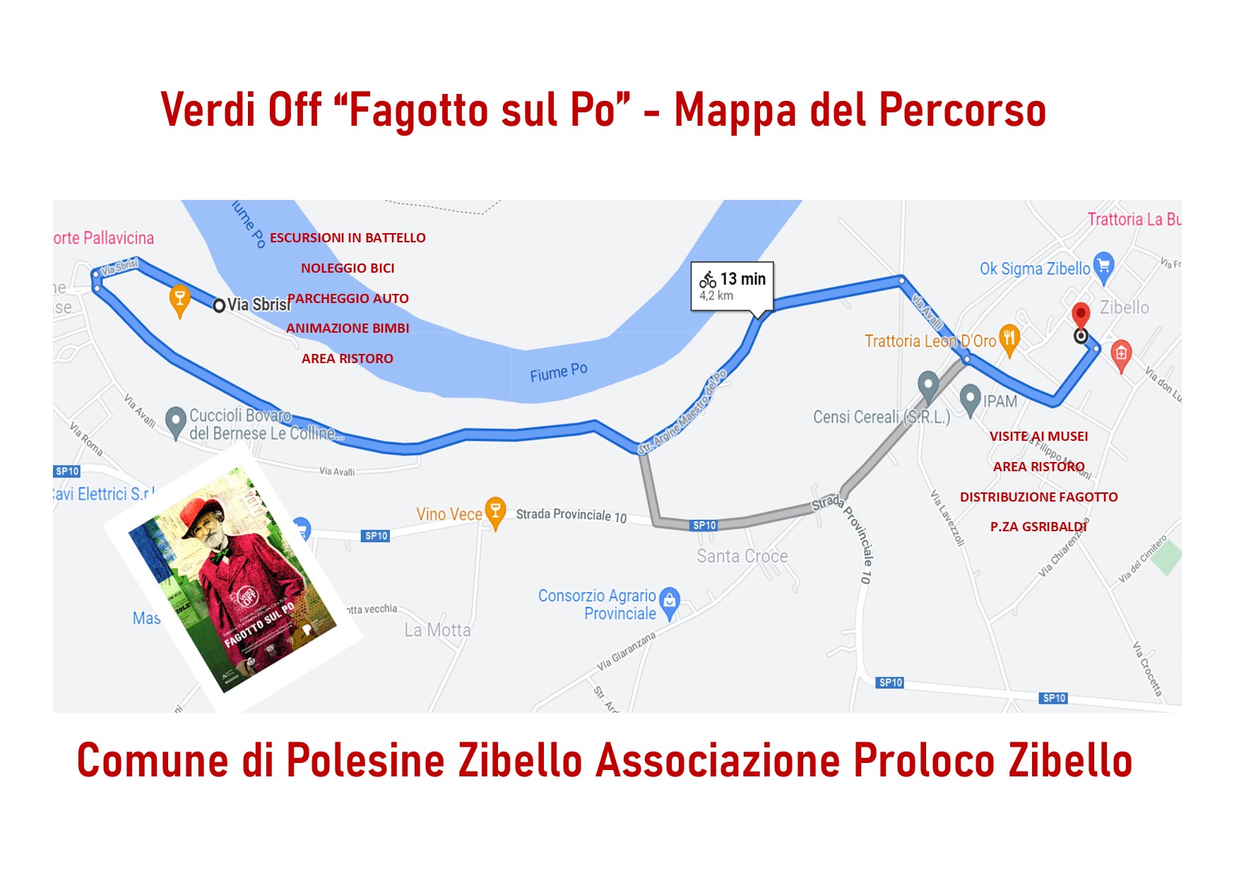 - per chi volesse si può comunque con bici propria oppure con bici a noleggio (in base a disponibilità e a un costo aggiuntivo di euro 5,00) oppure con proprio mezzo i turisti possono spostarsi a Zibello per la visita dell’Esposizione del Cinematografo e del Museo della civiltà contadina situati presso Chiostro ex convento Padri domenicani in località Zibello, Contrada Pallavicino.
