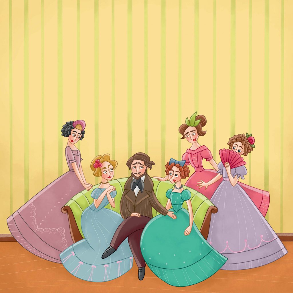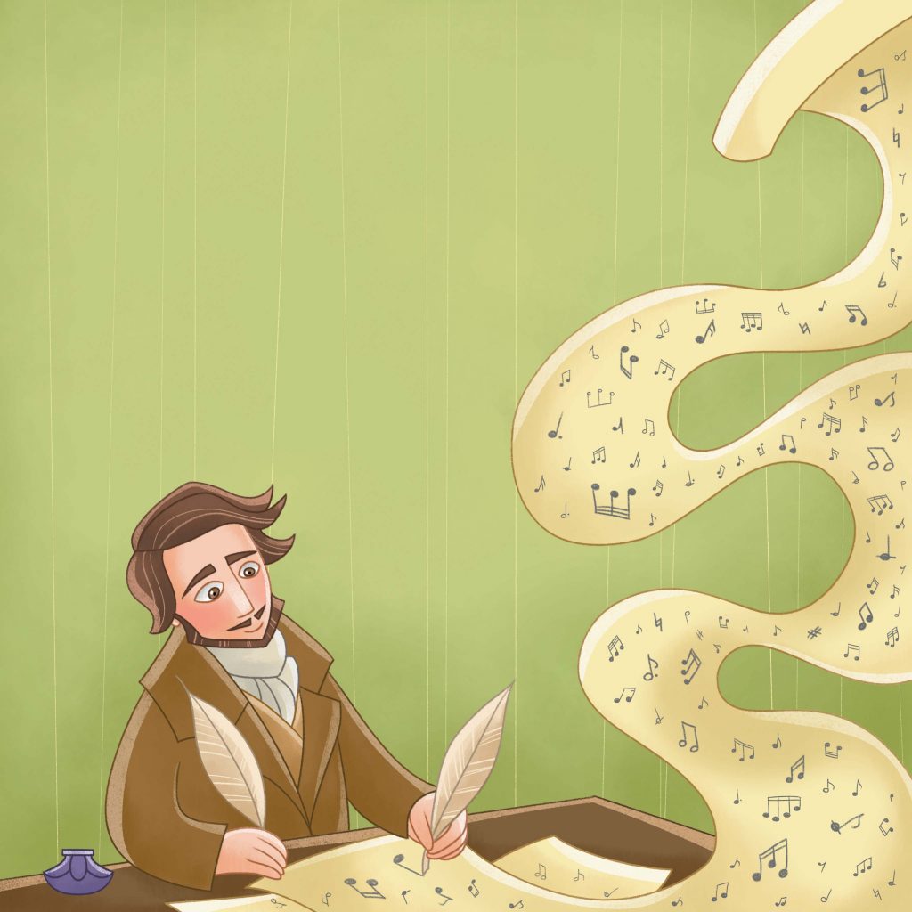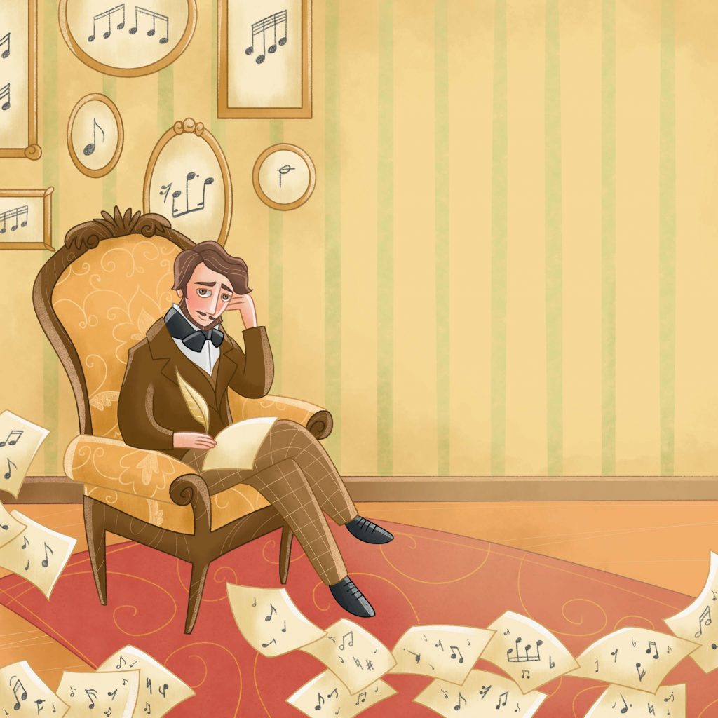 L’infanzia vissuta in povertà a Bergamo, l’incontro con il compositore che divenne più che un suo mentore, un secondo padre, Giovanni Simone Mayr, i primi successi ottenuti a poco più di vent’anni a Venezia, e poi a Roma, fino all’incontro con l’impresario Barbaja e il trionfo a Napoli, con la Lucia di Lammermoor. La fama di Donizetti, compositore d’opera prolifico e amatissimo, fiorita nell’età dell’oro dell’opera, era diffusa in tutti gli strati della società che il compositore, di bell’aspetto, era riuscito a conquistare anche grazie a un talento di canzoniere, tutt’ora poco conosciuto. La sua vita non fu certo priva di momenti drammatici e dolorosi – e “i bambini hanno bisogno di sapere che anche nelle vite più straordinarie ci sono dei fallimenti o comunque dei periodi difficili, spiega l’autrice, Cristina Bersanelli, e che ogni medaglia ha suo il rovescio”. E così anche per Donizetti arrivarono giorni tristi, funestati dalla perdita della bella moglie, Virginia, e dei figli, che culminarono con il trasferimento a Parigi e il rientro a Bergamo, dove il compositore finì i suoi ultimi giorni di vita, attorniato da una ristretta cerchia di amici.