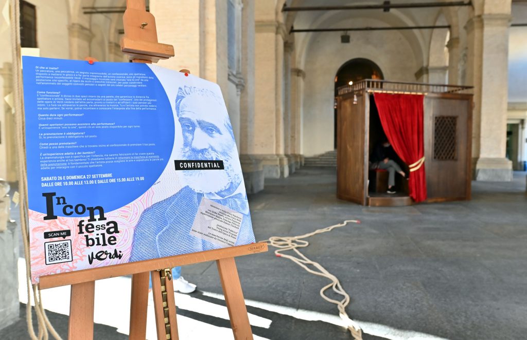 Un peccatore, una peccatrice, un segreto inammissibile, un confessionale, uno spettatore disposto a mettersi in gioco e a fare parte integrante dell’azione scenica: ecco gli ingredienti della performance Inconfessabile Verdi, dove il messaggio musicale è intonato “one to one” da una postazione mobile e site specific, al riparo da occhi e orecchie indiscreti, per poter rivelare nell’anonimato dei soggetti coinvolti pensieri e segreti mai espressi vissuti dai maggiori personaggi verdiani.